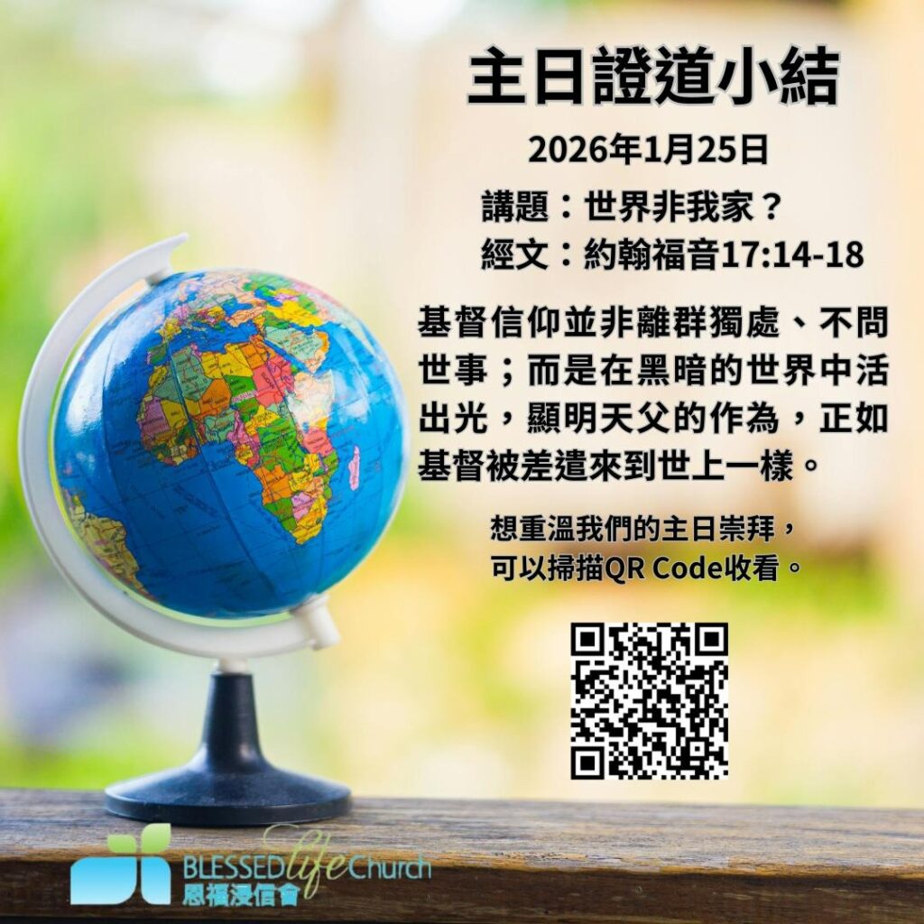 3. 線上主日學:由明年1月開始,逢每月第2及4個主日,晚上7:00至8:00,與你一起建立天國文化!第一課堂《尋找禱服靈》現已接受報名。敬請大家踴躍參與!若有任何查詢,可聯絡吳牧師或張牧師。
