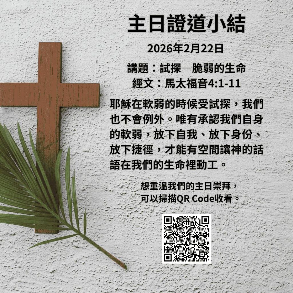 - 預備復活節期來臨:教會鼓勵弟兄姊妹一起參與大齋期40日靈修同行,透過靈修短片一起預備復活節期的來臨。影片將會透過Signal群體發放。另外,教會將會於4月4日晚上7:00於Victory Court舉行「聖週六崇拜」,請弟兄姊妹預留時間出席。
