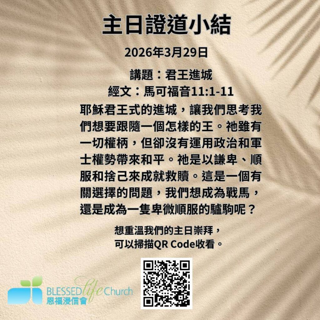 - 聖週六崇拜:於4月4日晚上7:00在Victory Court舉行,請弟兄姊妹預留時間出席。