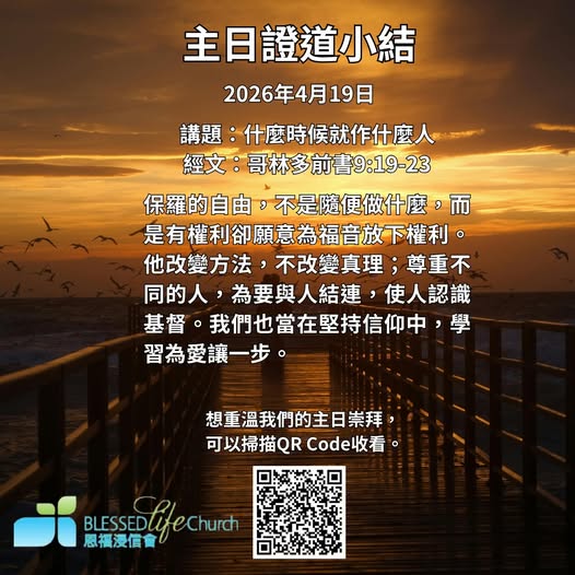 - 2026年浸禮及轉會禮:定於6月28日(主日),下午2:00至3:30在表爾威基督教會 (Bellevue Church of Christ 10419 SE 11 th Street, Bellevue) 舉行。凡有志受浸、慕道者及有志轉會者,請與牧師或長執查詢,浸禮班於5月3日開始。
